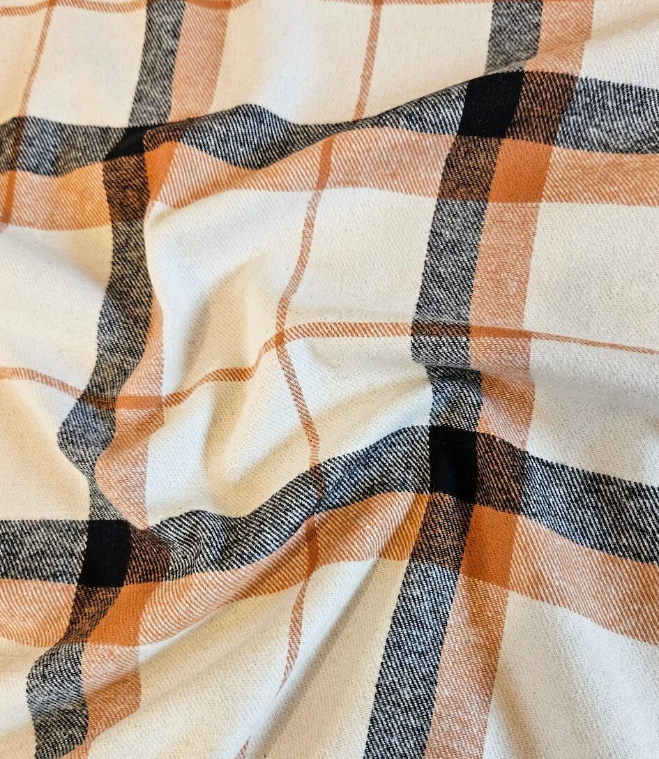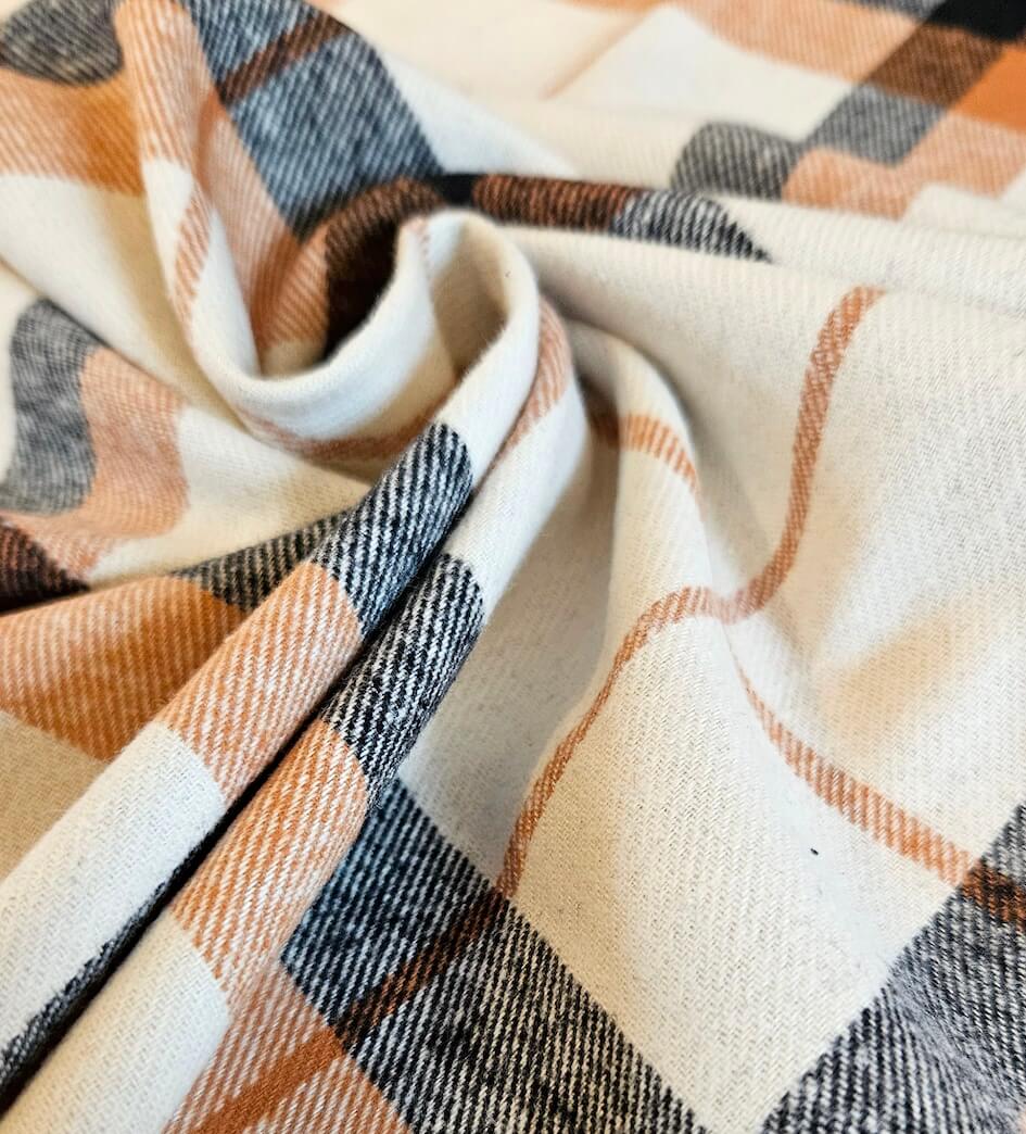 La palette de couleur de cette flanelle de coton est à première apparence très sobre. Du beige, du bleu très foncé et une touche de terracotta. Cet assemblage en fait un tissu passe partout dans une famille de carreaux plus urbains et élégant voir un poil parisien. C’est aussi la flanelle à carreaux la plus lumineuse de la collection qui pourra sans problème être portée toute l’année.