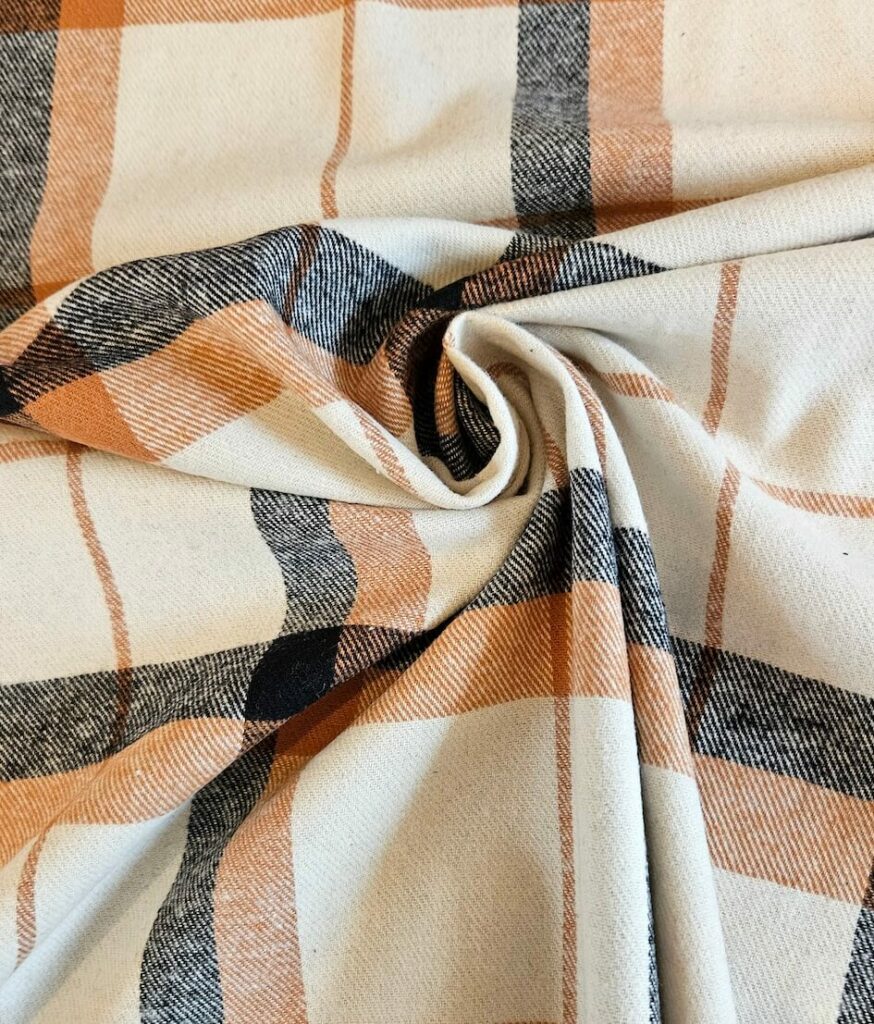 La palette de couleur de cette flanelle de coton est à première apparence très sobre. Du beige, du bleu très foncé et une touche de terracotta. Cet assemblage en fait un tissu passe partout dans une famille de carreaux plus urbains et élégant voir un poil parisien. C’est aussi la flanelle à carreaux la plus lumineuse de la collection qui pourra sans problème être portée toute l’année.