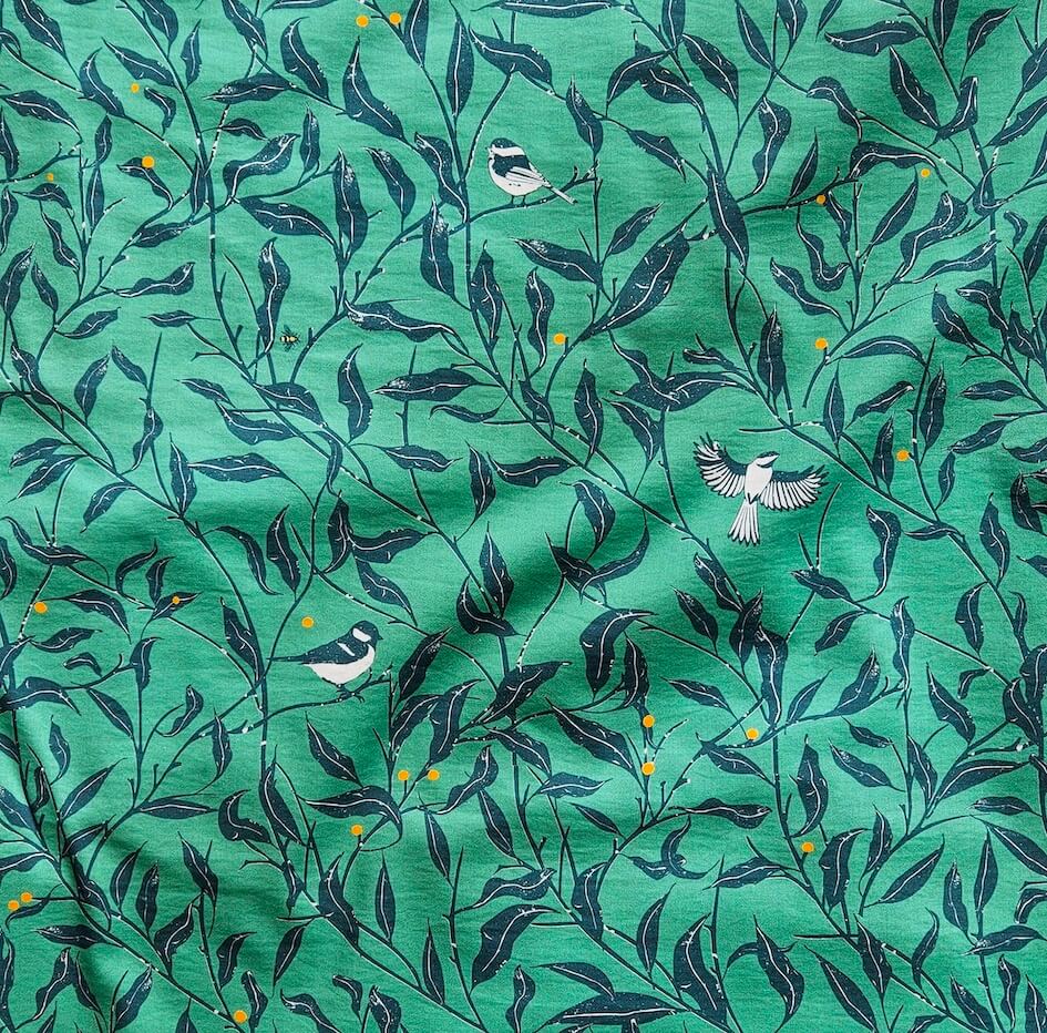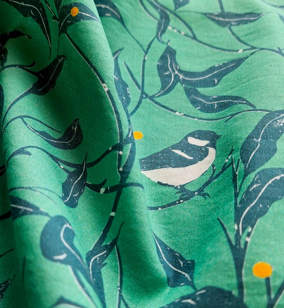 Pour être 100% honnête avec vous, ce motif a été créé en vert. Parce que qui dit frondaison, dit vert ! Mais si j’ai choisi au final de jouer le contraste inverse en jouant des motifs en foncé sur un fond vert plus printanier et léger, c’est justement pour apporter de la fraicheur, de la couleur et de la légèreté à ce motif. Le vert est devenu une nouvelle couleur neutre qui se porte avec tout. Et c’ets très vrai avec cette combinaison de vert.