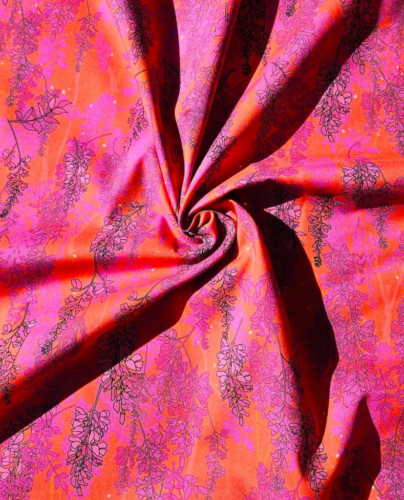 Je dois vous raconter l’histoire de ce motif. Parce qu’il ne devait pas du tout être édité. Mais en automne 2023, mon éditeur s’est un peu mélangé les pinceaux dans les différents motifs à imprimés et finalement, une semaine avant le salon Création et Savoir Faire à Paris, je reçois 12 mètres de ce motifs qui pourtant avait été annulé. J’ai évidemment emporté le tissu (imprimé alors sur une gabardine) au salon. Et évidemment, en deux jours, il n’en restait plus. Et quand j’ai mentionné sur instagram l’histoire de ce tissu collector, vous avez été très nombreuse à demander une ré-édition. Aujourd’hui le motif revient, mais sur de la popeline douce et légère, toujours aussi lumineux, mais toujours en toute petite quantité.