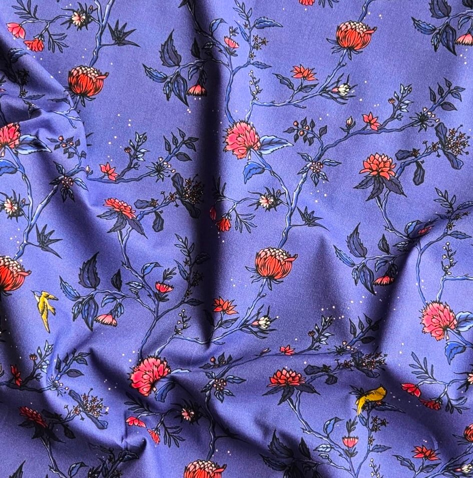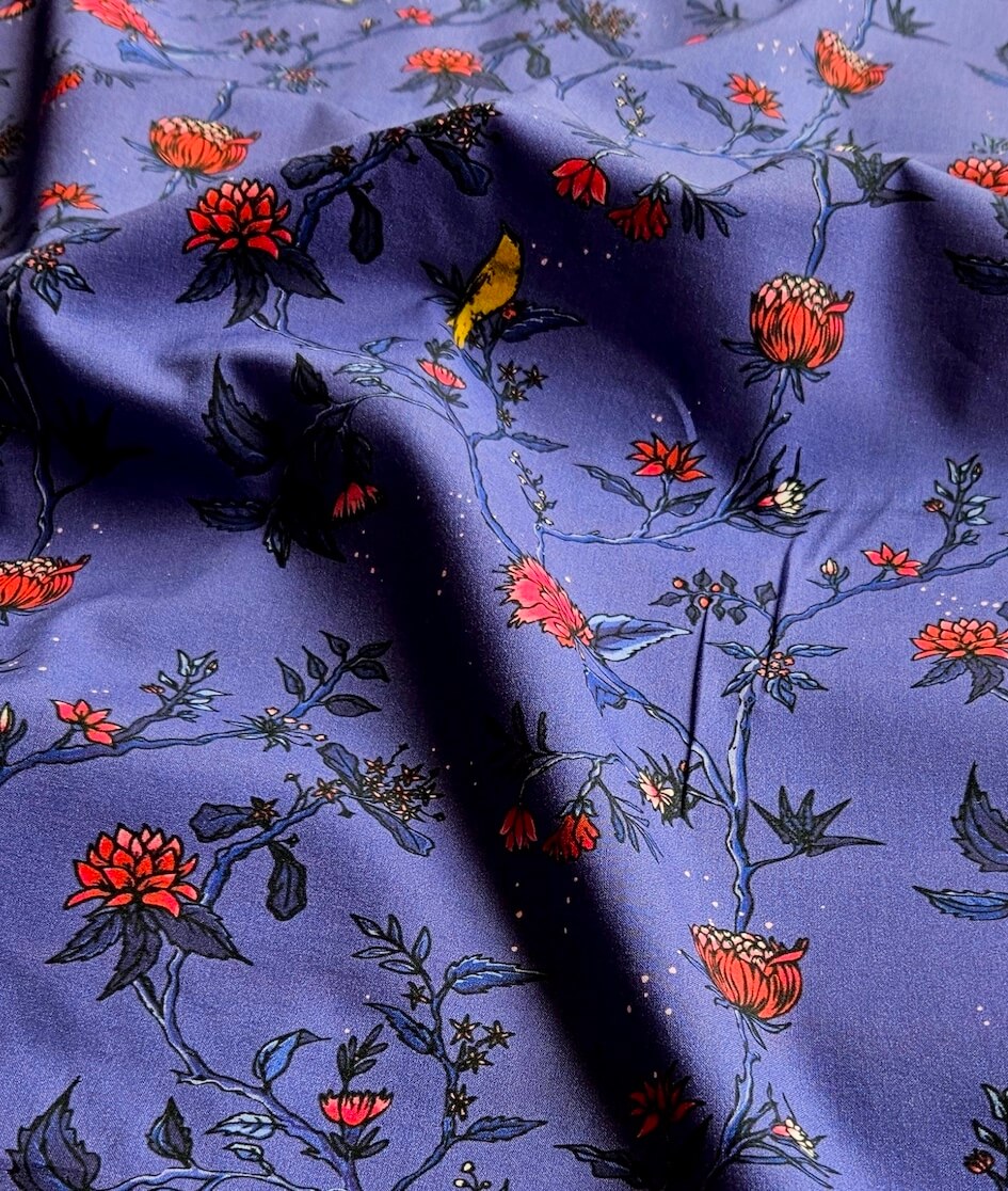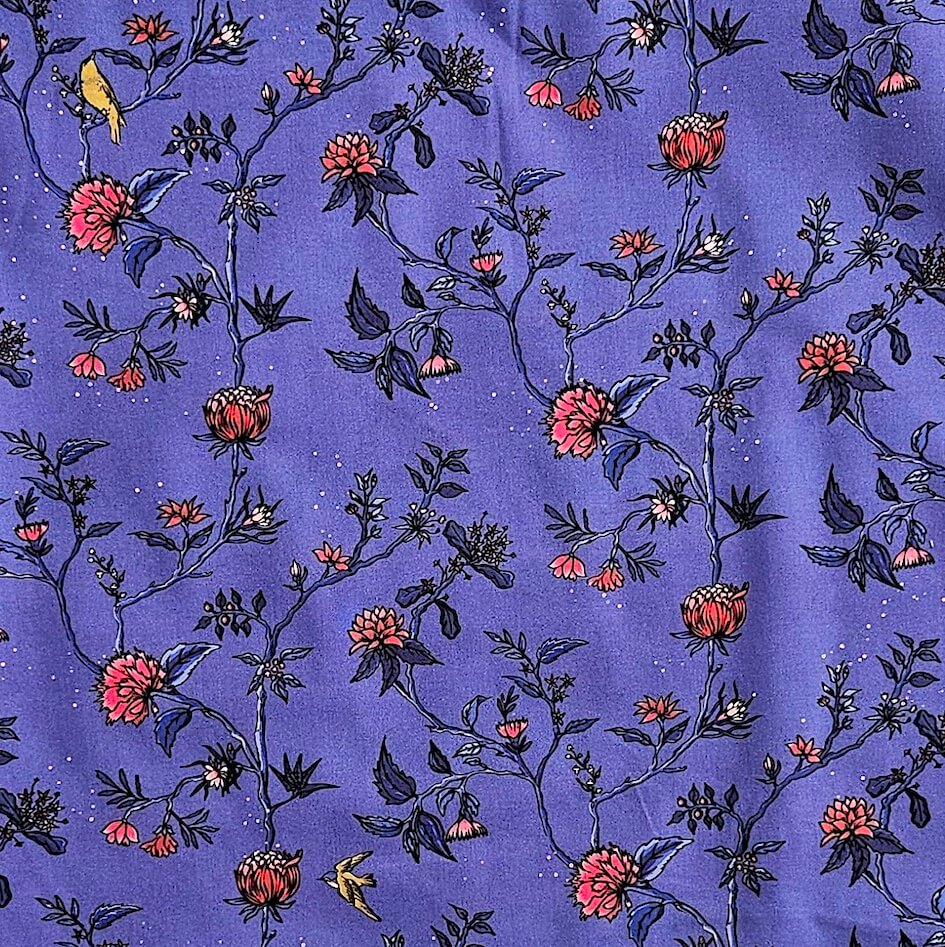 Les indiennes sont des motifs inspirés des cotonnades qui sont arrivées en Europe au 16ieme et 17 ieme siècle. Un arbre infini, des botaniques fantasques et des fleurs en pagaille. Ce motif est très spécial sur un fond violet qui met en évidence les fleur rose-rouge et le dessin de l’arbre infini. Légèrement et douce, cette popeline sera parfaite pour coudre des blouses, chemises ou petits hauts d’été.